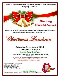 The United Women in Faith will hold their Annual Christmas Luncheon on Saturday, December 6, 2025, from 12 noon -3 pm at the Argyle Country Club, 14600 Argyle Club Road, Silver Spring, MD 20906.  The cost for adults is $65; for children’s cost, please contact Doris, Dana or Kim. First payment is due anytime in October; final payment is due by November 21, 2025.